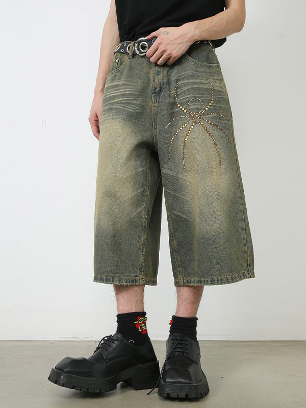 Men’s Spider Rhinestone Loose Casual Denim Shorts