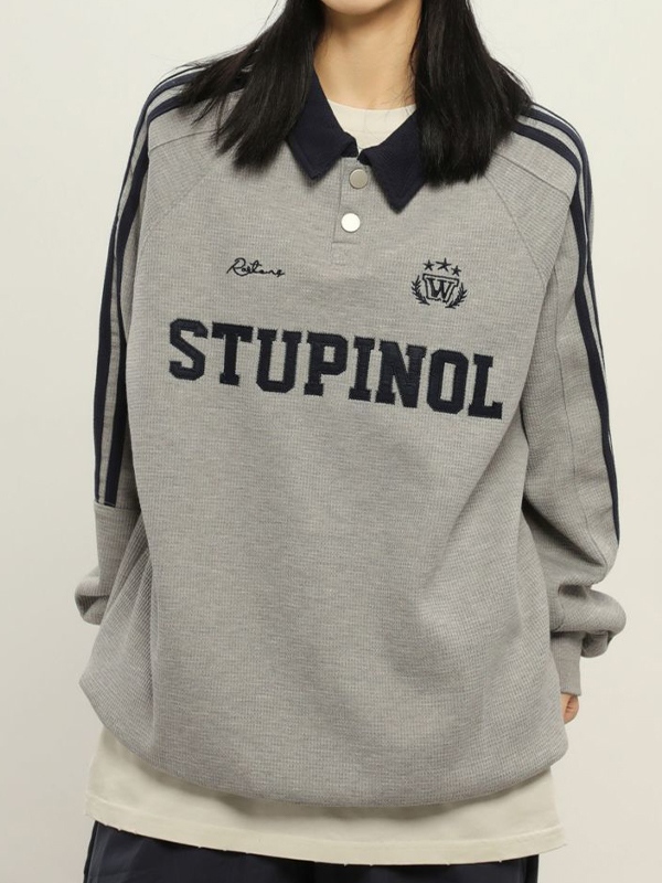 Letter Embroidered Piping Lapel Neck Sweatshirt