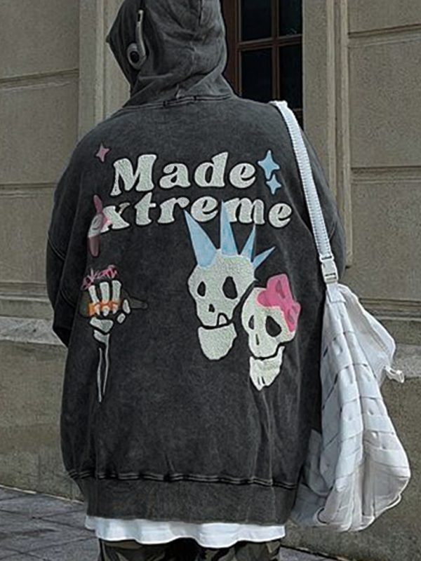 Men’s Hip Pop Distressed Skull Print Oversized Hoodie