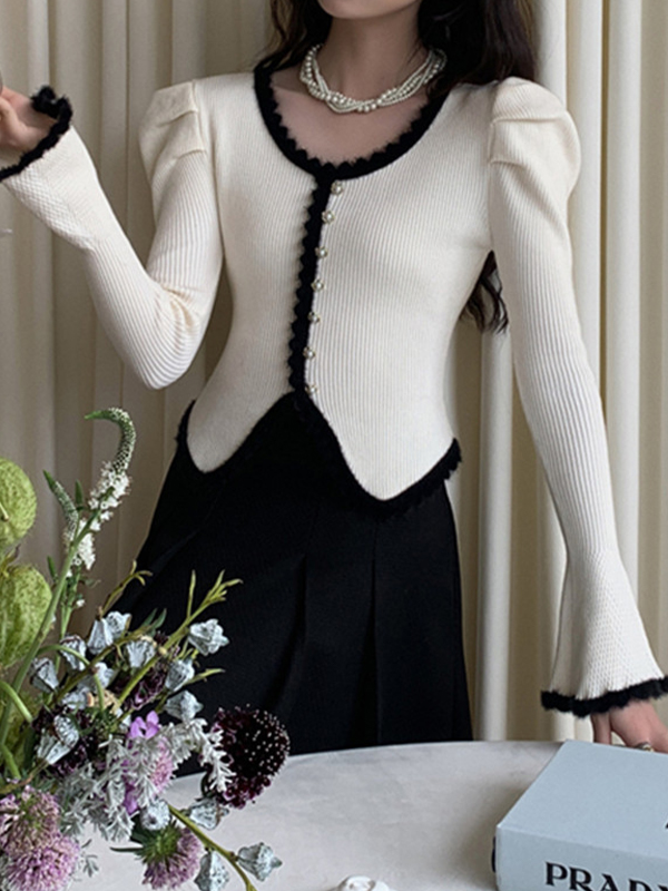 Be the first to review “Contrast Color Scallop Trim Puff Sleeve Cardigan”