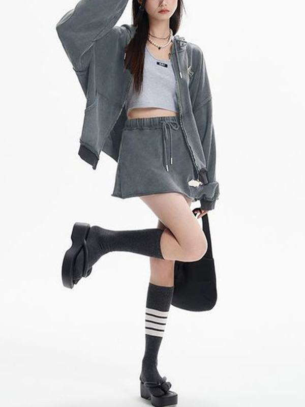 Be the first to review “Distressed Washed Double Zip Hoodie&Frayed Hem Skirt Set”