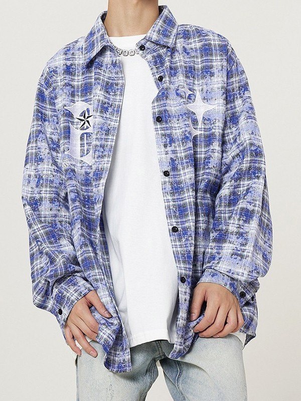 Men’s Embroidered Tie Dye Checkered Long Sleeve Shirt