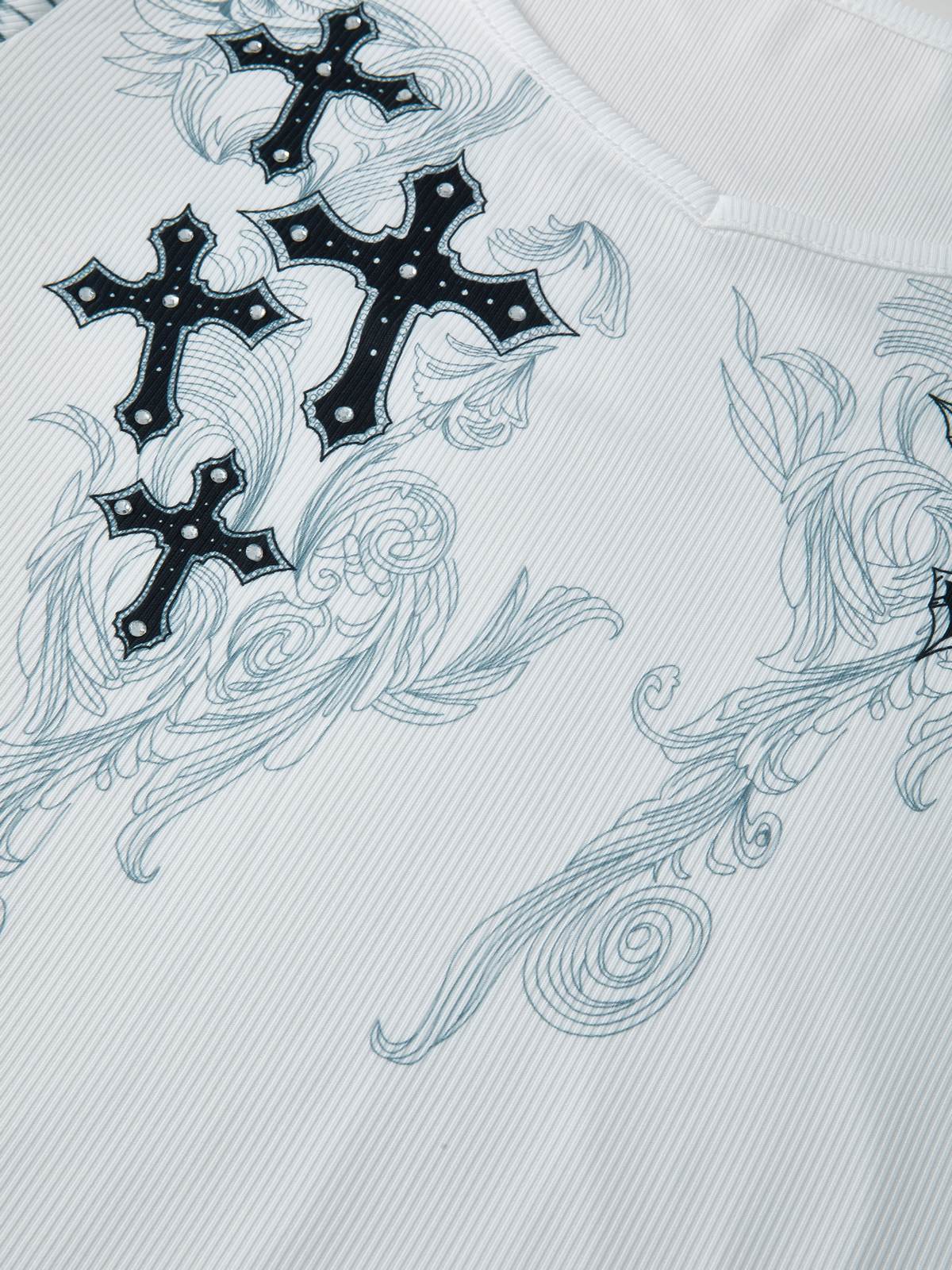 -Acanthus cross pattern print with rhinestone decors on it, and wing graphic design to the sleeves add a retro and mystical touch.