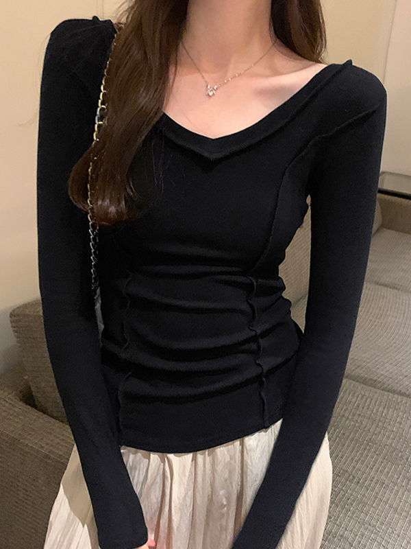Solid V Neck Seam Detail Slim Long Sleeve Knit